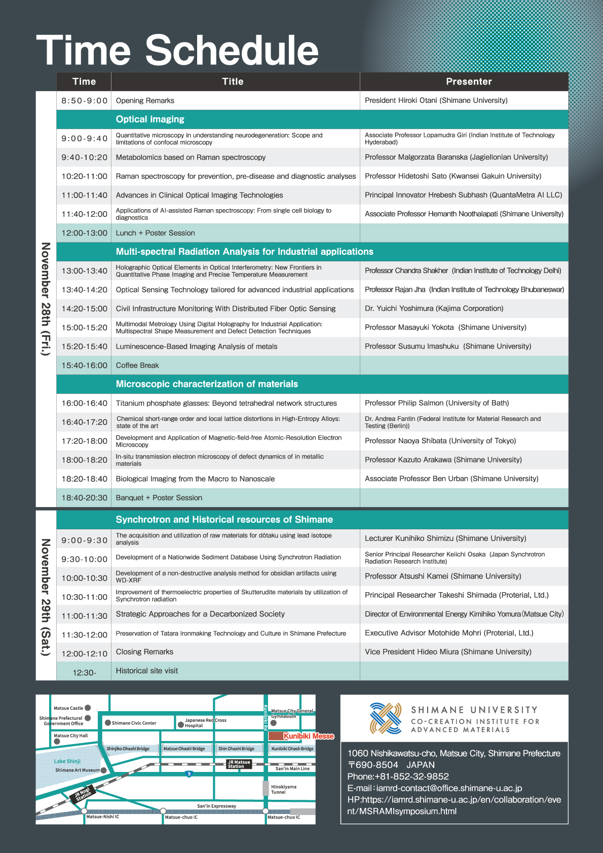 | Contact information | Shimane University Co-Creation Institute for Advanced Materials Regional Revitalization Promotion Division Research and Regional Revitalization Department iamrd-contact[a]office.shimane-u.ac.jp ※Please change [a] to @ when you send e-mail. |