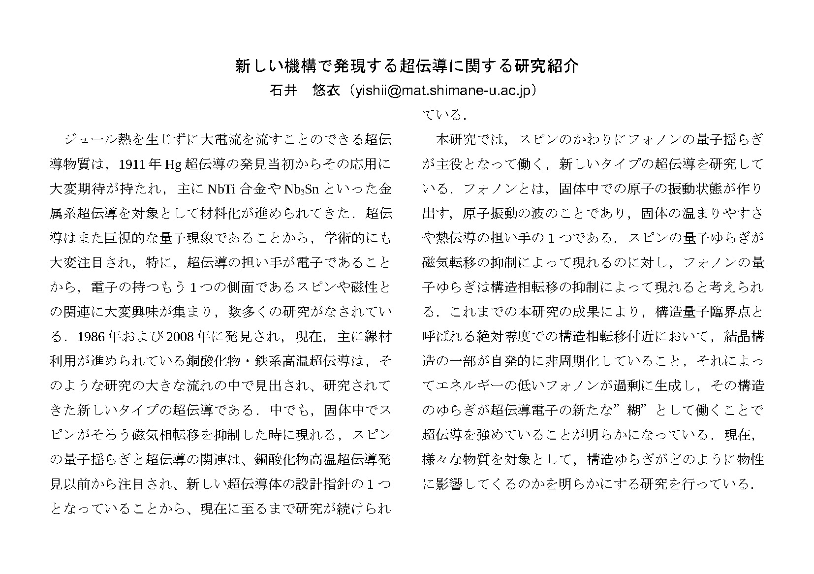 4.新しい機構で発現する超伝導に関する研究紹介 石井 悠衣教授