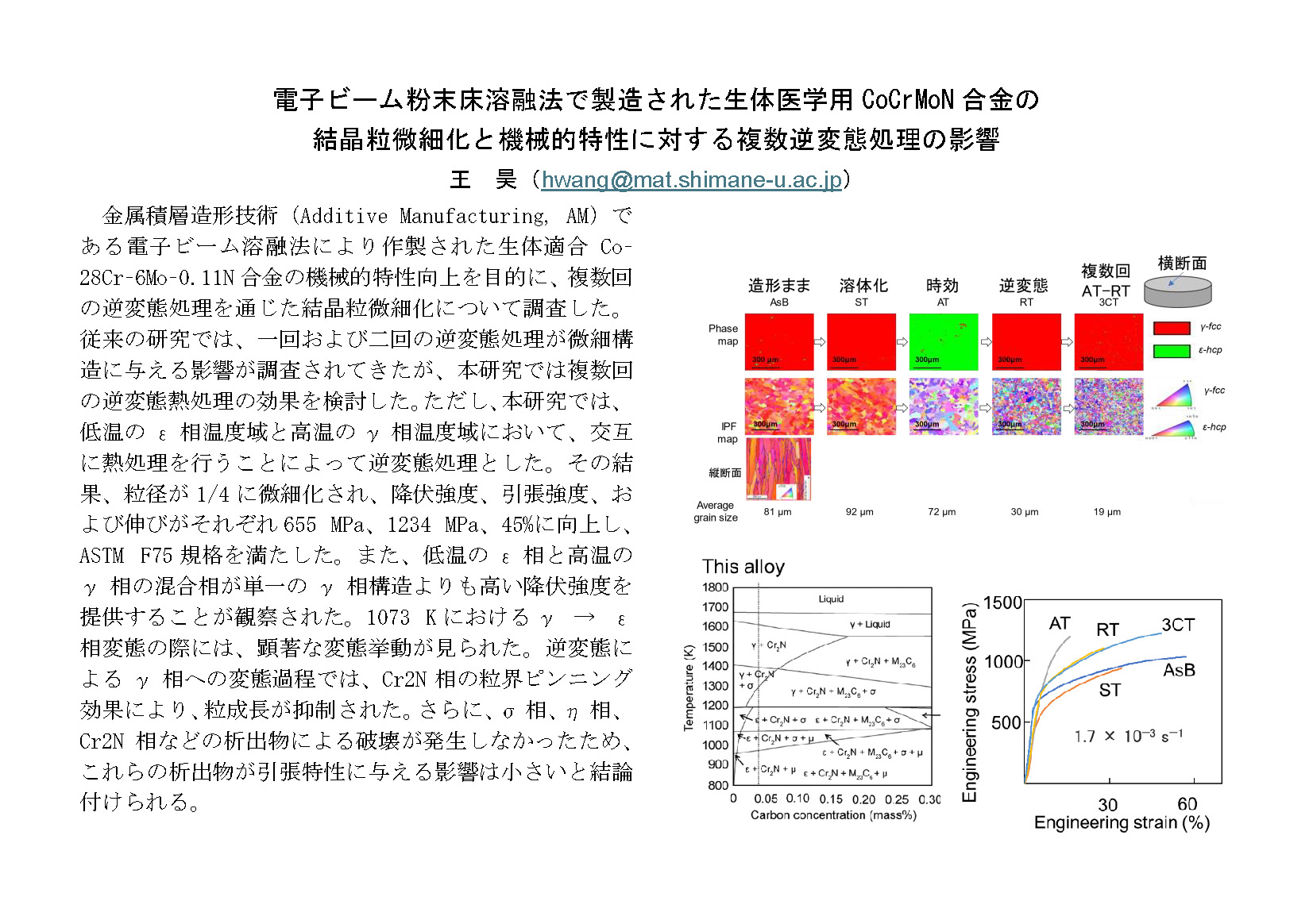 7.電子ビーム粉末床溶融法で製造された生体医学用CoCrMoN合金の結晶粒微細化と機械的特性に対する複数逆変態処理の影響 王 昊准教授